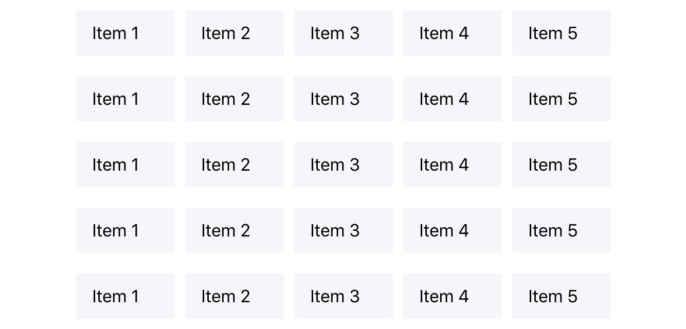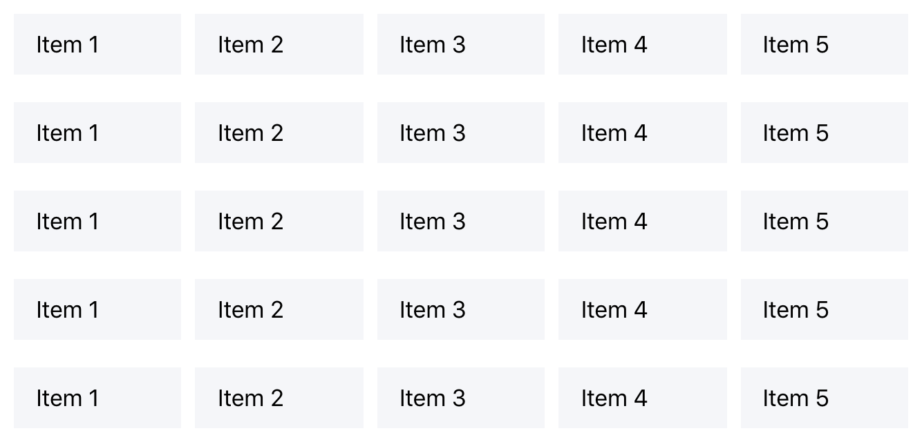 この場合、5 つのアイテムがそれぞれ 100%の幅で表示されます。これは携帯電話ではきれいに見えるかもしれませんが、大きな画面で見ると話は別です。画面幅が広いため、アイテムが画面いっぱいに引き伸ばされ、画面スペースが使われないままになってしまうのです。